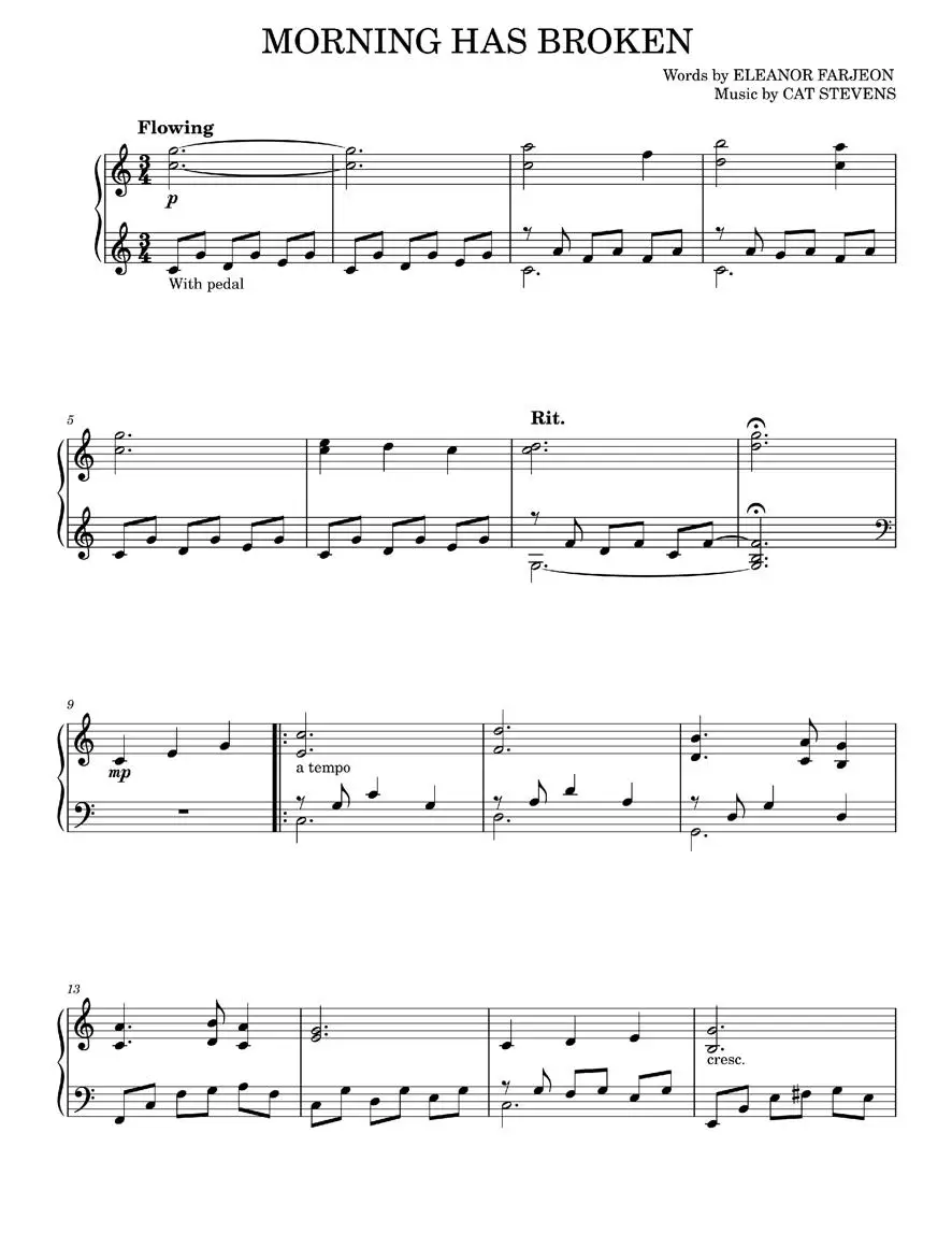 This sheetnotes file contains an arrangement for solo piano of the classic song "Morning Has Broken" composed by Eleanor Farjeon and Cat Stevens. The arrangement consists of 5 pages, 85 measures, and is scored in C major/A minor. It's a great piece to learn if you're a fan of Cat Stevens and want to play a beloved classic on the piano!