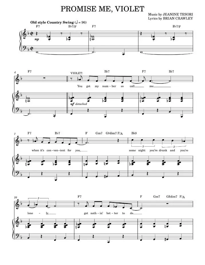 This sheetnotes file contains the musical score to "Promise Me, Violet" by Brian Crawley and Jeanine Tesori. This 10-page score features music by Jeanine Tesori and lyrics by Brian Crawley, and spans the keys of F Major and D Minor over 123 measures. A perfect resource for any pianist, singer, or music enthusiast, "Promise Me, Violet" is sure to bring magic to any practice or performance.