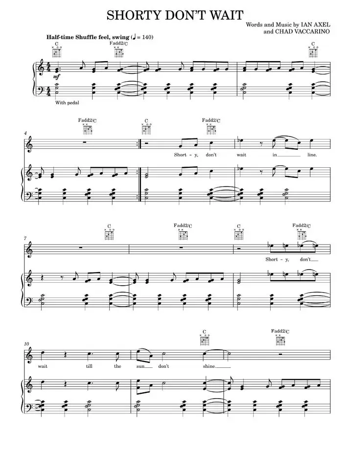 This sheet music for "Shorty Don't Wait" by A Great Big World is a five page songbook for Piano-Vocal-Guitar, composed by IAN AXEL and CHAD VACCARINO. This song consists of 57 measures in the keys of C major and A minor. It is a great way to learn this uplifting hit with chord diagrams and lyrics included.