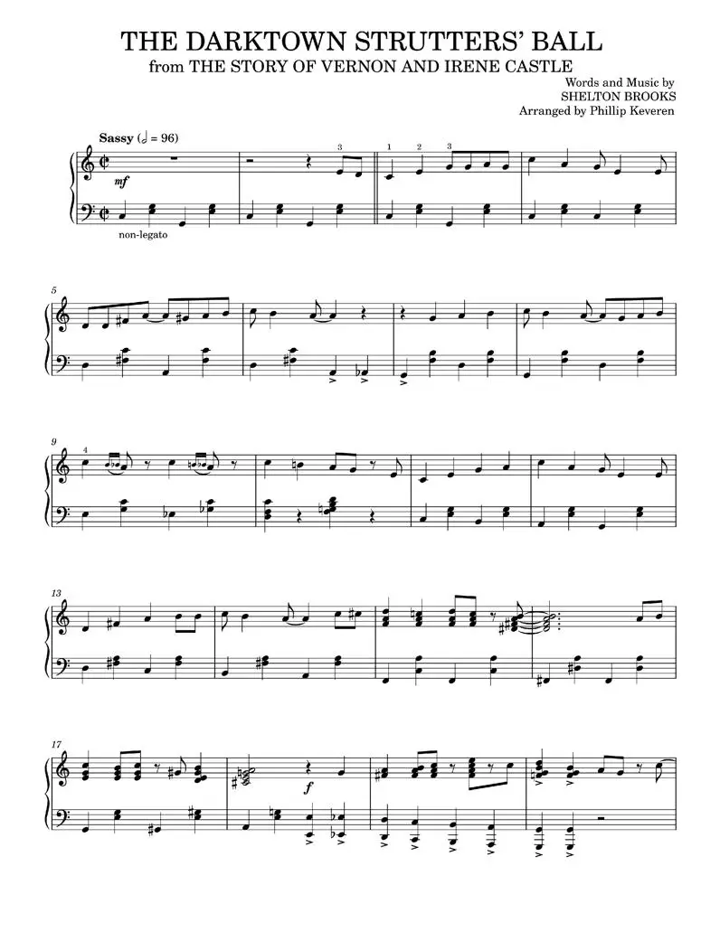 This sheetnotes file contains the jazz version of the popular song "The Darktown Strutters' Ball," arranged for piano solo by Phillip Keveren. It features the iconic performance of Fred Astaire and Ginger Rogers from the film The Story of Vernon and Irene Castle, as well as Sophie Tucker and Ted Lewis. The song consists of 43 measures in the keys of C Major and A Minor.