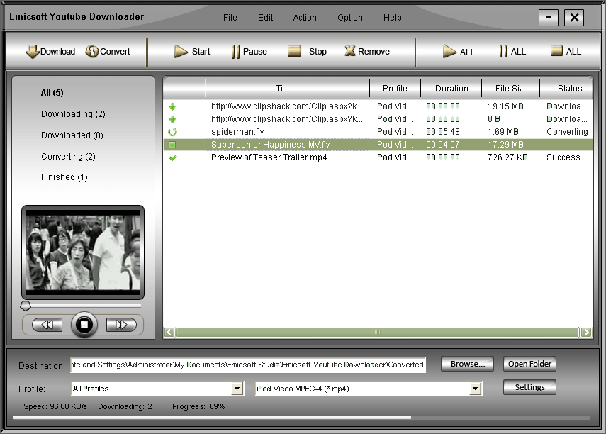 Emicsoft YouTube Downloader is a professional YouTube downloader online software with which users can download videos from various popular video-sharing sites. The downloader supports a vide range of protocols including http, rtsp, rtmp, mms and more threads for downloading task. The YouTube Downloader is also a good converter software which can convert all downloaded videos or local video files (*.flv, *.f4v and *.swf) to video/audio formats and supports playing downloaded videos on iPod, iPhone, PSP, PS3, Xbox, Wii, BlackBerry and more digital players and mobile phones.
