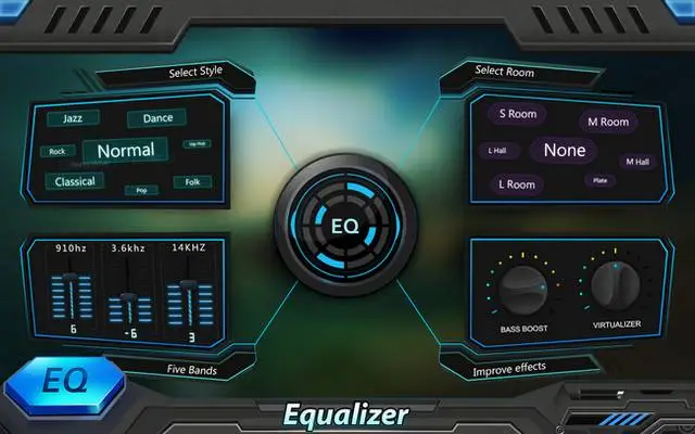 Equalizer & Bass Booster is a volume slider with live music stereo led VU meter and five band Equalizer with Bass Booster and Virtualizer effects.