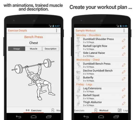 - Many preinstalled exercises with description, animations and trained muscle.