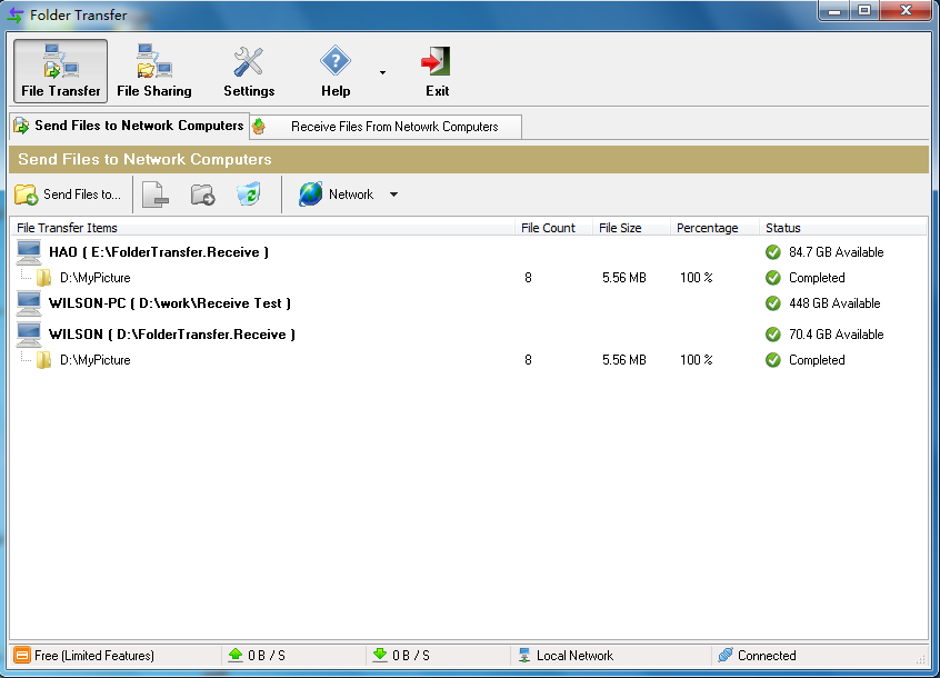Folder Transfer can transfer files and folders to multiple computers over local network or Internet/Intranet. You can also share your computer files and folders to let other network users download anytime.