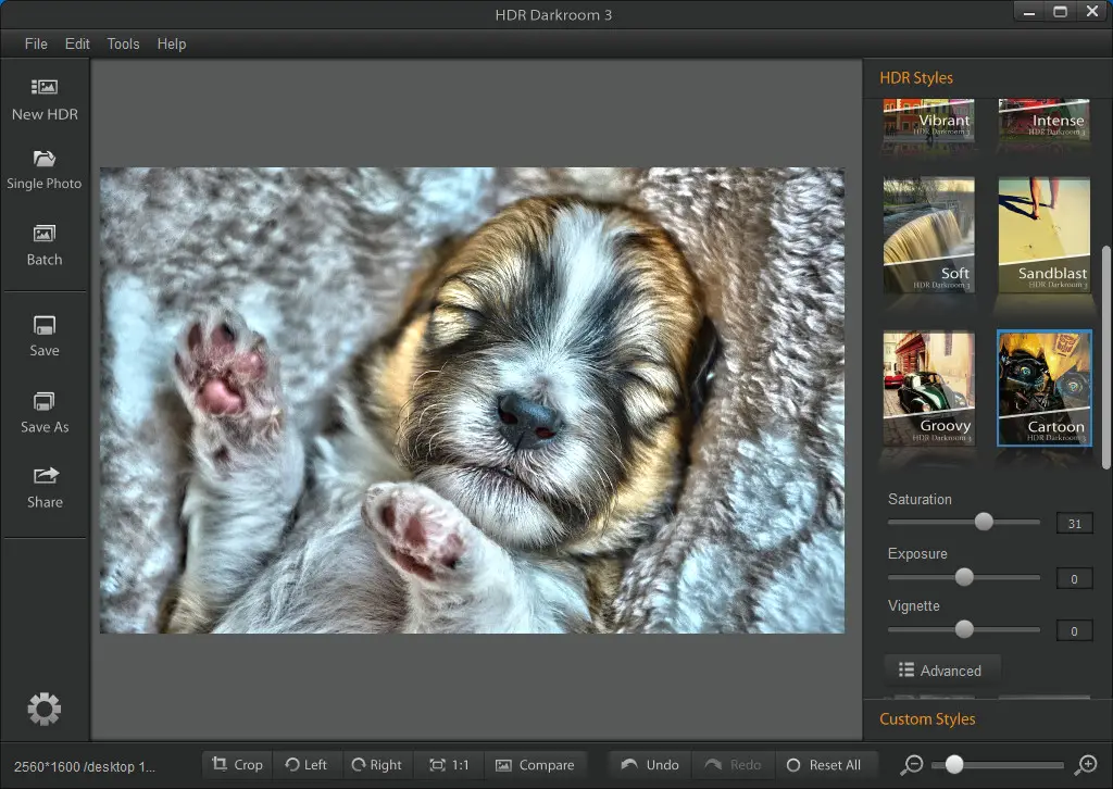 Choose from 16 HDR Styles to quickly and easily give yourself more editing options. Change up the look of you image, from realistic to artistic to futuristic. You can even modify them and save your own Custom Styles!