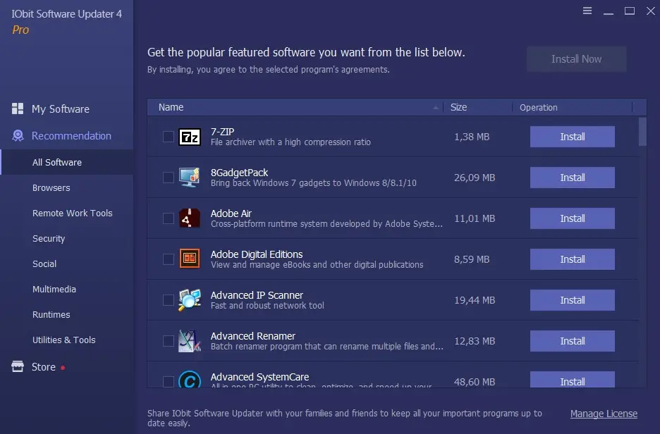 Besides, IObit Software Updater provides a large and rapid-growing software database for featured must-have software in various categories: Browsers, Security, Social, Multimedia, Runtimes, and Utilities & Tools. You can easily and quickly install all selected software with 1-click without worrying about annoying ads and/or bundleware, even malware. It must be your best choice when you need to install many programs, especially when you get a new computer or after you reinstall, format, or upgrade your computer.