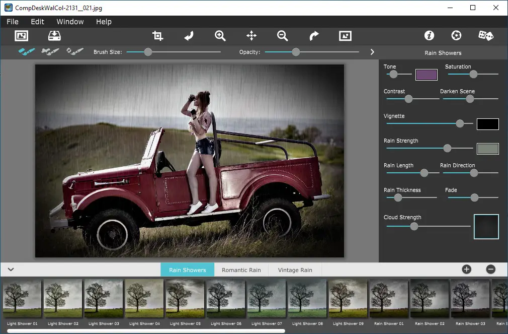 Rainy Daze puts power and emotion in your photography with this stunning rain effect. Envelop your photos with soft mist's romantic glow, wash your landscapes clean of imperfection, and bring drops of meaning, large and small, fast or smooth, to your personal expression.