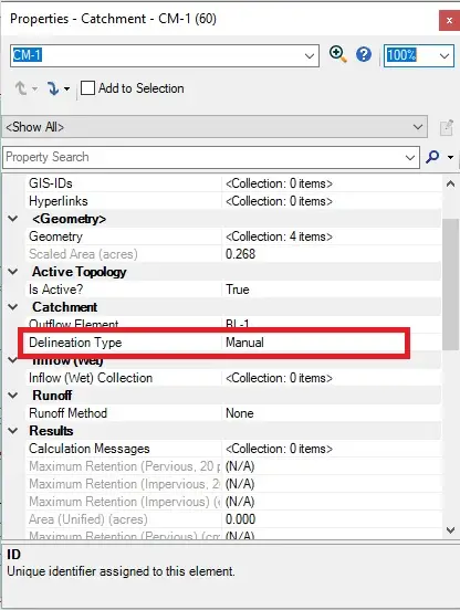 Functionality has been added to automated catchment delineation in the Terrain Models manager to preserve the shape and location of catchments that were added to a model manually. This will help you model catchments if there are any issues with the accuracy of the terrain model. A new property field, Delineation Type, has been added to the catchment properties.
