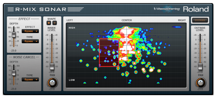 R-MIX SONAR Edition allows you to visually manipulate an audio mix. Powered by Roland’s V-Remastering technology, R-MIX SONAR Edition lets you see the components of a stereo mix as color-coded clouds of energy and harmonic matter as the song plays. Visualizing the sound allows you to use not only your ears but also your eyes to understand the layout and placement of the instruments. You can select any components of the mix, and freely edit them. By moving and adjusting the frame provided by R-MIX SONAR Edition, you can mute or extract specific regions of the visualized sound, in this way altering the volume balance in very precise ways. You can change panning positions and levels to individual instruments within a stereo mix, for example, and add effects to each element as desired.