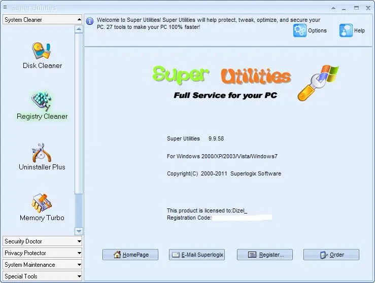 Super Utilities offers 28 tools for fixing, speeding up, maintaining, and protecting your PC. Super Utilities - Make your computer run faster, safer, with greater privacy and security. With only a few minutes of tweaking, Super Utilities will optimize the performance of your computer, corrects problems and helps you to customize your system to suit your needs. Super Utilities (for Windows 98/Me/2000/XP/2003/Vista) is a collection of tools to fix, speed up, and maintain your PC! These utilities include Disk Cleaner, Registry Cleaner, Uninstall Plus, StartUp Manager, Folder Guard, Tracks Washer, Driver Backup, Auto Shutdown, Windows Manager and Process Manager. With a cool and user-friendly interface makes it easy for anyone to use Super Utilities.