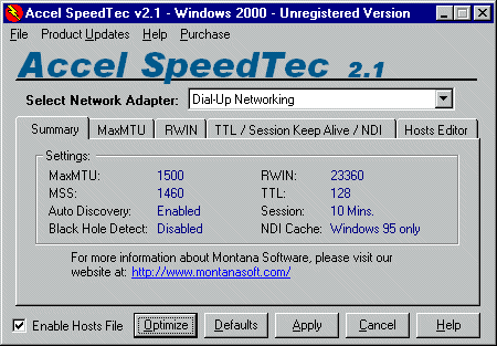 Accel SpeedTec speeds up your access to the Internet! This program modifies the settings on your Windows system, allowing information to flow faster through any connection.