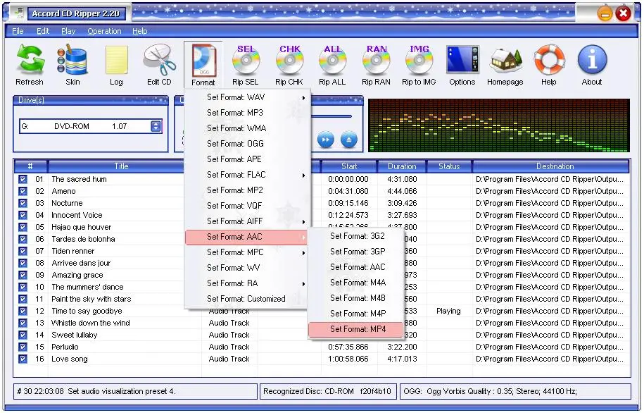 Accord CD Ripper allows the users to encode audio CDs to customized formats thru their own encoders. Theoretically, Accord CD Ripper can rip audio CD tracks to INFINITE audio formats.