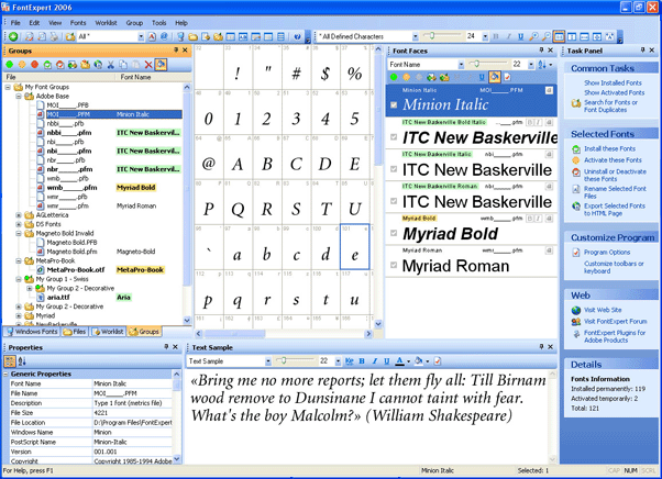 FontExpert 2006 ver.8.00 Release 5 | 4,90 MB FontExpert 2006 enables you to preview and manage both installed and uninstalled typefaces, plus examine your system for font errors. You can display the list of installed font faces, customizable font samples and advanced font properties. The program allows you to print different types of reports, and offers many printing options.