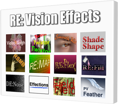 RE:Vision Effects plugins for After Effects, Vegas Pro, Final Cut Pro, Shake, Premiere Pro, Fusion, Nuke, generationQ, Autodesk Systems, Avid Systems and Softimage.